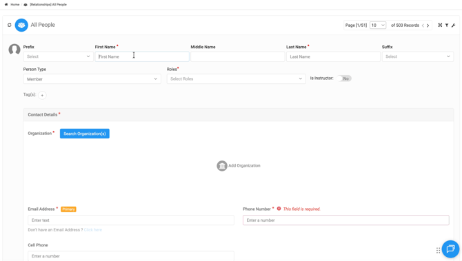 Next, associate the person with an organization. You can search for an existing organization from your system or create a new one if necessary.