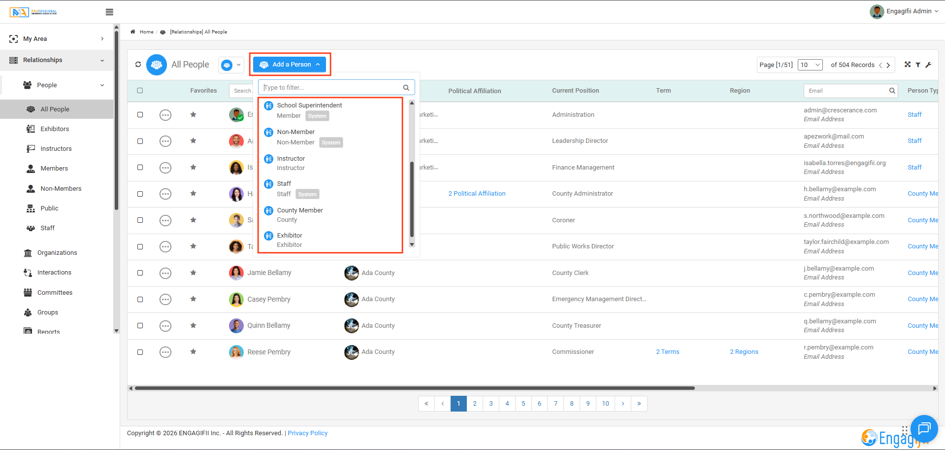 This section will show a list of all the individuals currently in your system, including their roles, organizations, and contact information.