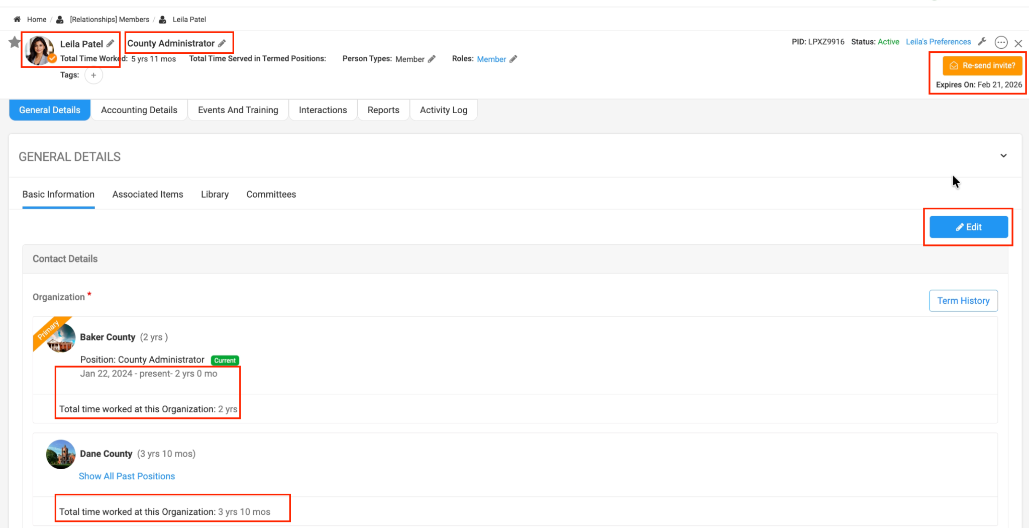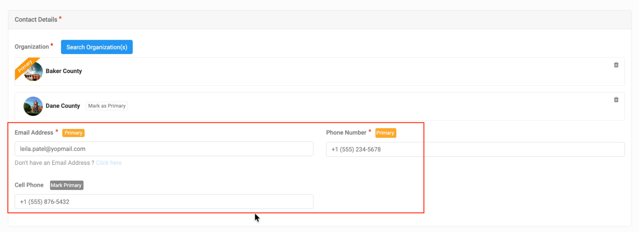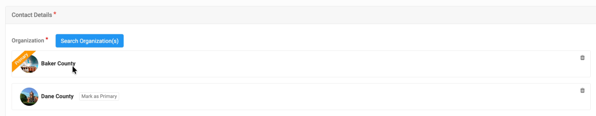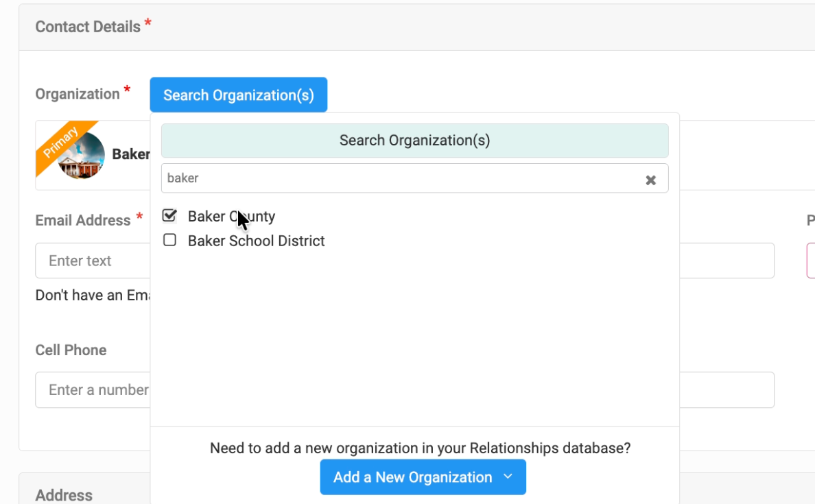 - Select the organization the individual belongs to (e.g., Baker County). If they belong to multiple organizations, mark the correct one as primary.