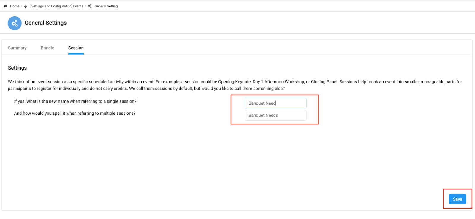 - In the “Rename Sessions” fields, type the term you want to use instead (for example, Banquet Needs).